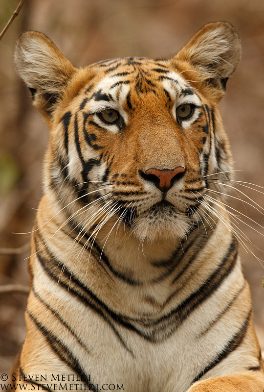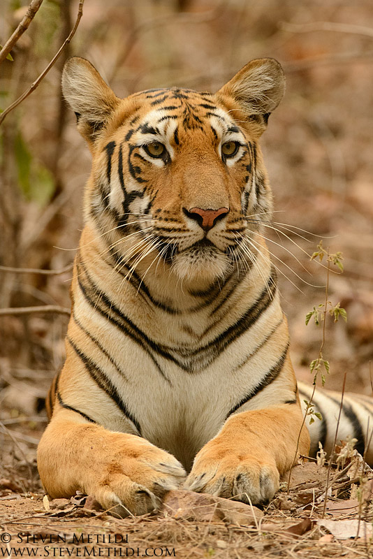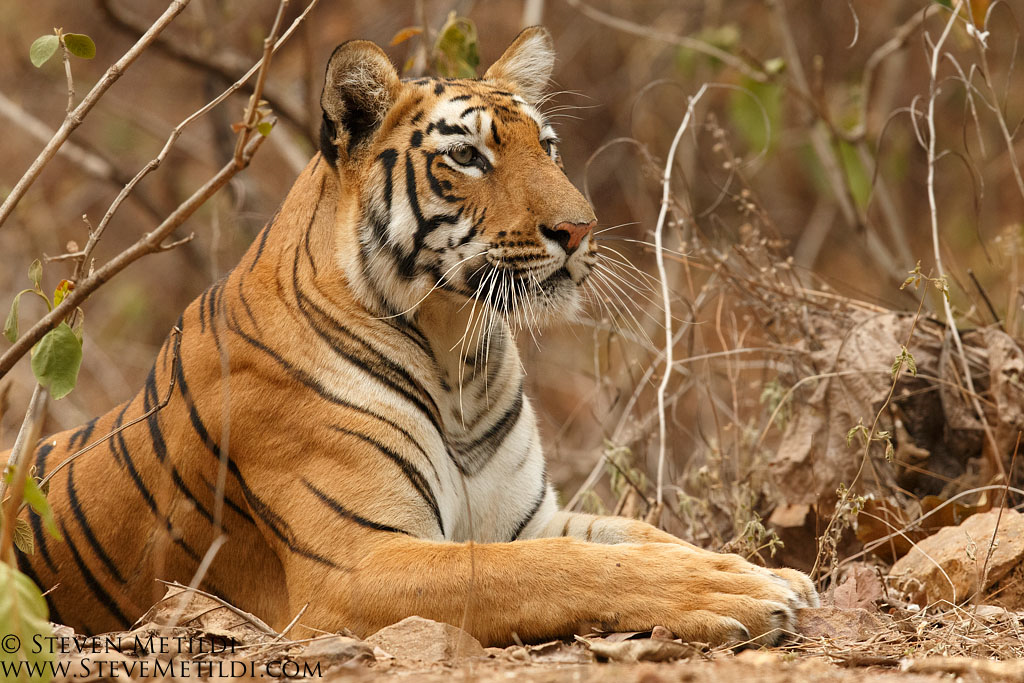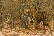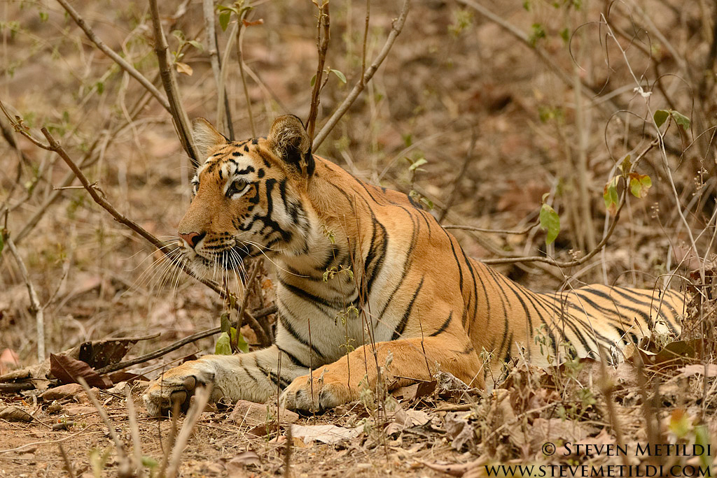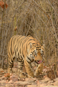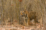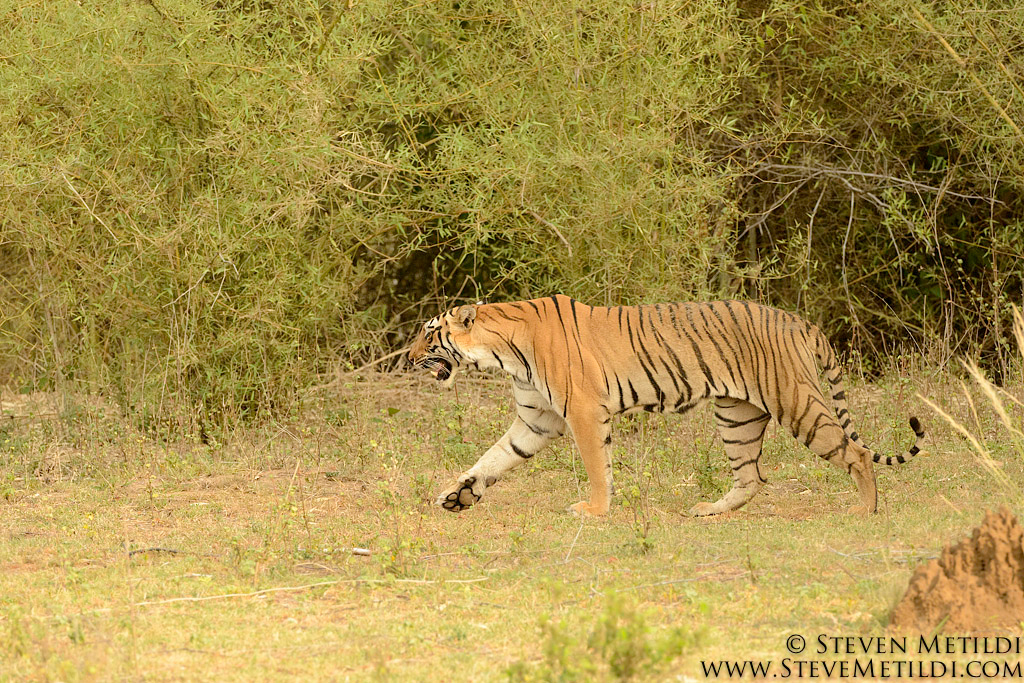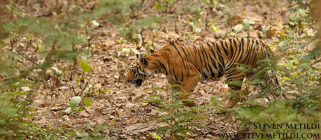 Bengal Tiger - the most endangered of the big cats and also the most elusive and difficult to photograph. It's estimated that in total only 3,200 wild Tigers now remain compared to the 100,000 that existed 100 years ago. Note her alert posture, she had just noticed a small band of Wild Boar. For more information on wild Tigers check out www.panthera.org - a great conservation organization for all the big cats.