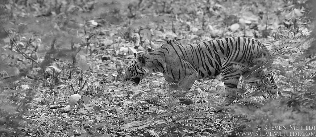 Bengal Tiger in full stalk of Wild Boar. This stalk took several minutes and she eventually disappeared into the forest. There was then a lot of commotion, several Wild Boar sprinted out of the area, and we then heard a deep, blood curdling scream. A few minutes later she ran out of the forest with a dead Wild Boar in her jaws. Unfortunately my photos of her with the boar were all severely obstructed.