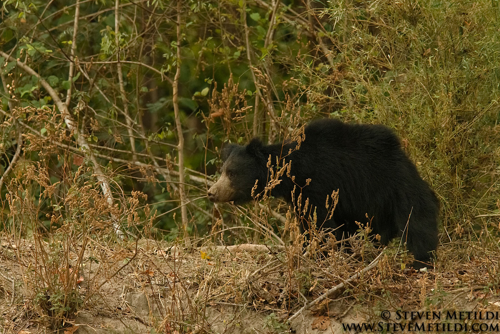 Sloth Bear -feeds primarily on insects (termites and ants) and fruit and are not carnivorous. However, they are territorial and there are a fair number of attacks on humans in India. Earlier in the week we saw a family of Tigers deep inside a Bamboo thicket on a Sloth Bear they had killed during the night.